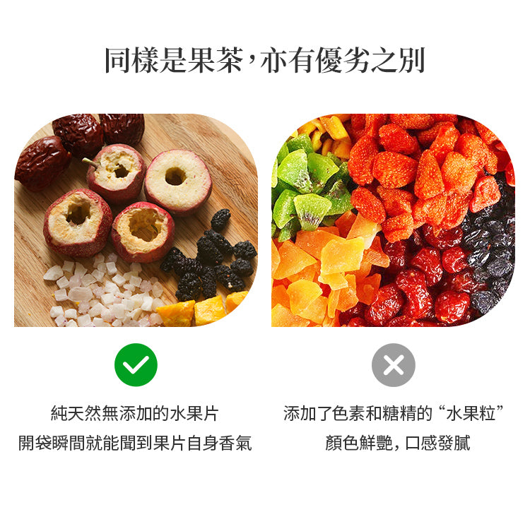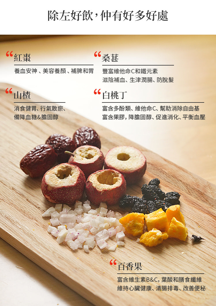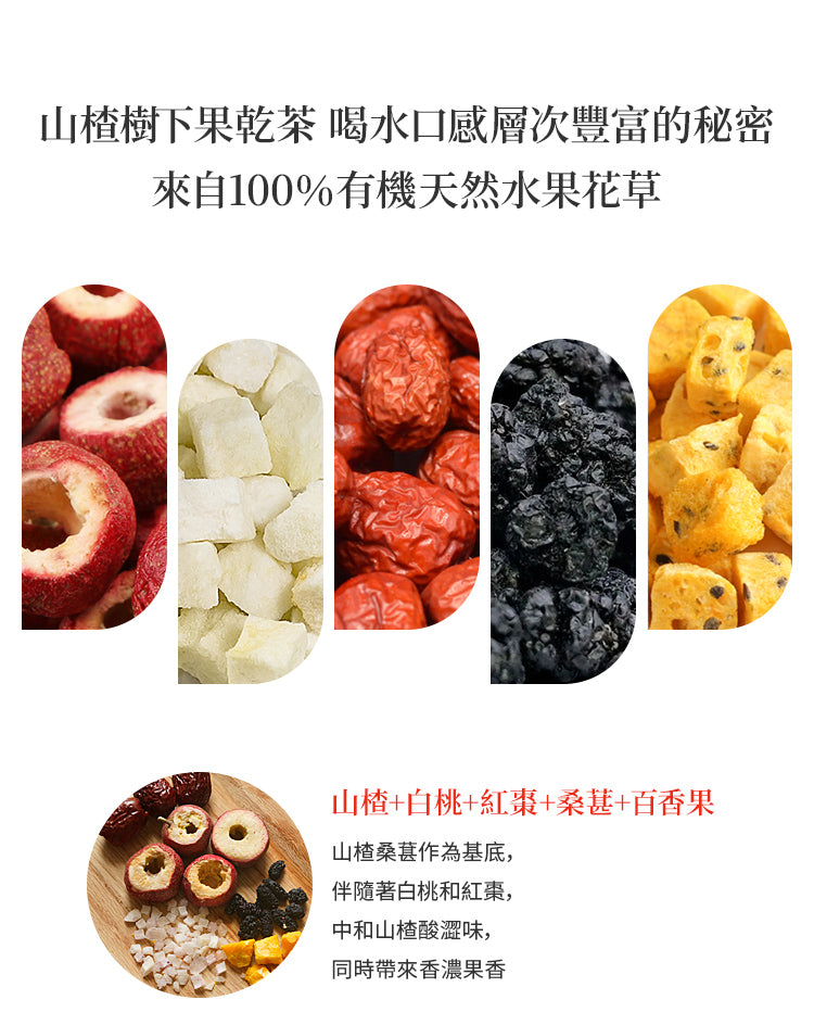 成分:山楂、紅棗、桑葚、白桃丁、百香果