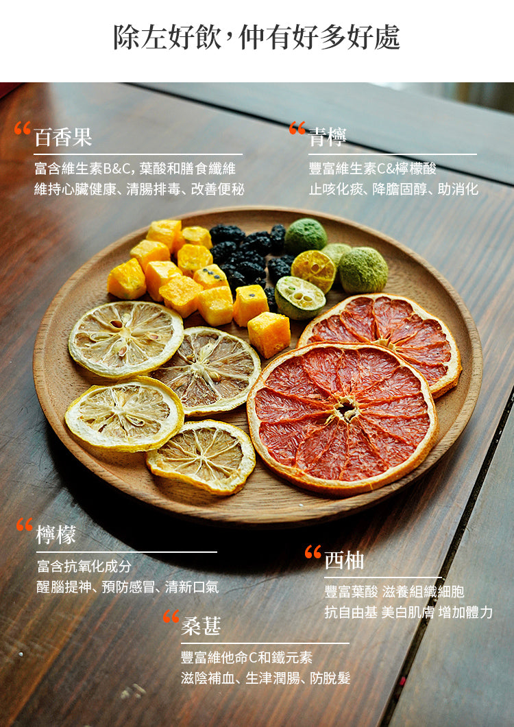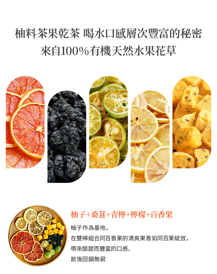 成分:西柚、凍乾檸檬、桑葚、凍乾百香果、凍乾青檸、冰糖